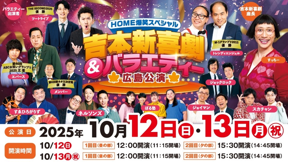 広島ホームテレビ(所在地:広島県広島市中区白島北町)は、恒例の人気イベント「HOME爆笑スペシャル 吉本新喜劇&バラエティー」を、2025年10月12日(日)・13日(月・祝)に上野学園ホールで開催します。