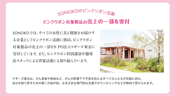 SONOKOは、すべての女性に美と健康をお届けする企業として、ピンクリボン活動を推進し、1人でも多くの女性に、乳がんの予防と、乳がん検診の大切さを知っていただきたいと願っております。