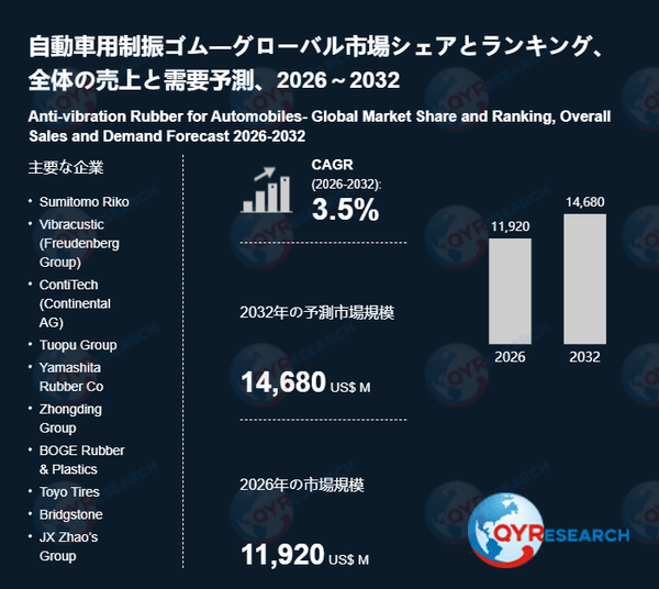 QYResearchが発表した新たな市場調査レポート「自動車用制振ゴム―グローバル市場シェアとランキング、全体の売上と需要予測、2026~2032」によると、世界の自動車用制振ゴム市場規模は2025年の約11550百万米ドルから2026年の11920百万米ドルへと順調に拡大すると見込まれ、予測期間中は年平均成長率(CAGR)3.5%で成長し、2032年には14680百万米ドルに達すると予測されている。
