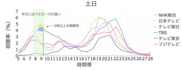 多くの人が休日であるため活動開始が遅く、朝帯の視聴率のピークが平日に比べて1〜2時間遅くなっています。8〜12時台にかけて、「シューイチ(土曜)」などを放送している日本テレビ、「王様のブランチ(日曜)」などを放送しているTBSが他局よりも最大で2倍以上の高視聴率を獲得しています。