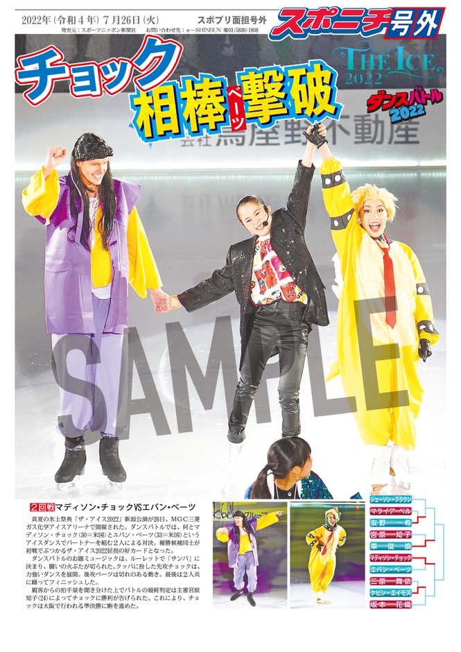 公演内で行われるトップスケーターによる人気企画「ダンスバトル」の様子を、会場内とスポニチが販売しているコンビニのコピー機によるプリントサービス号外「スポプリ」で販売します。普段とは違った衣装を身にまとって滑る選手たちの熱いパフォーマンスを速報とともにお届けします。