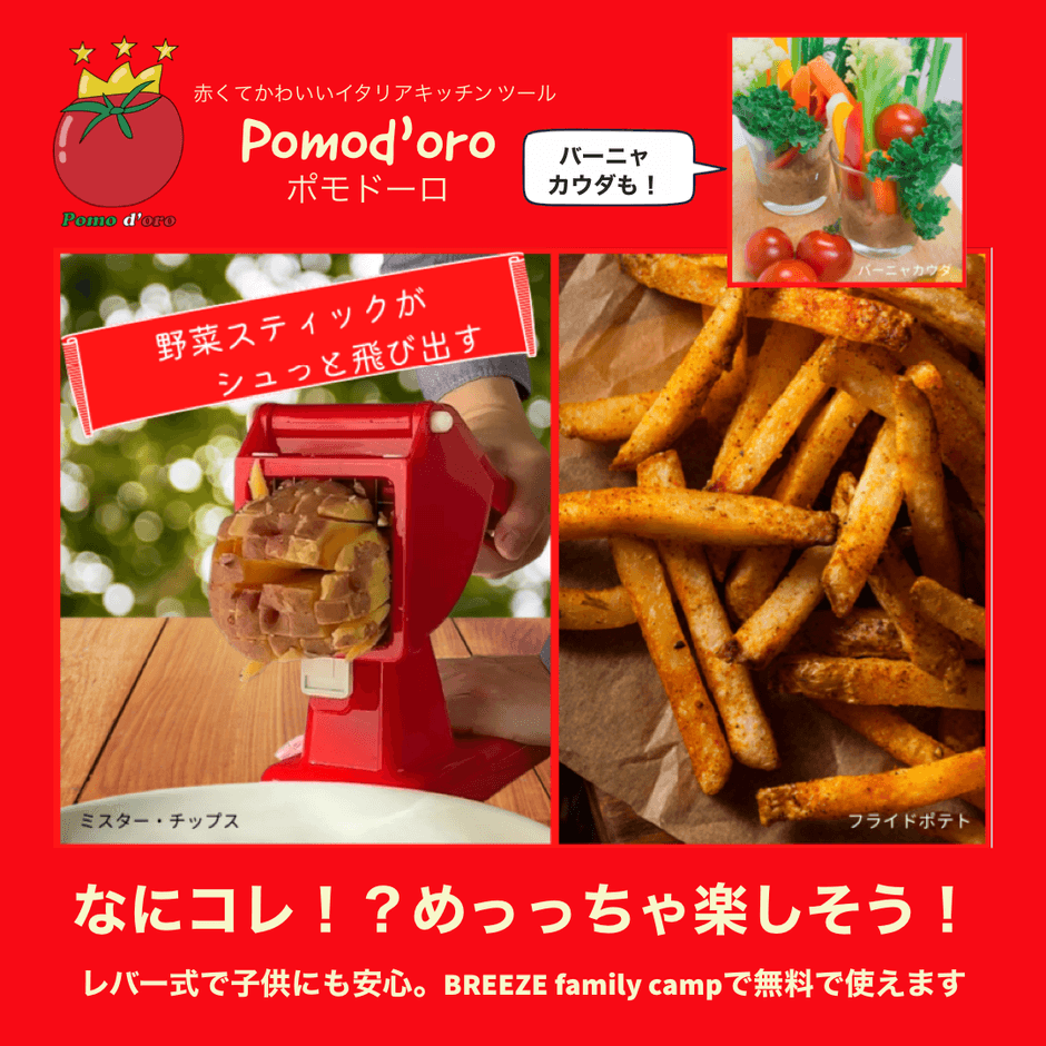 千葉県館山市のキャンプ場BREEZE Family Campよりまたまたコラボ企画登場!Pomod'oro(ポモドーロ)協賛により赤くてかわいいイタリアキッチンツール2点が無料で使えちゃう!操作はハンドルタイプなのでお子さまでも安心。青空の下、楽しくユニークなキッチンツールであなただけのキャンプ飯を作ろう!