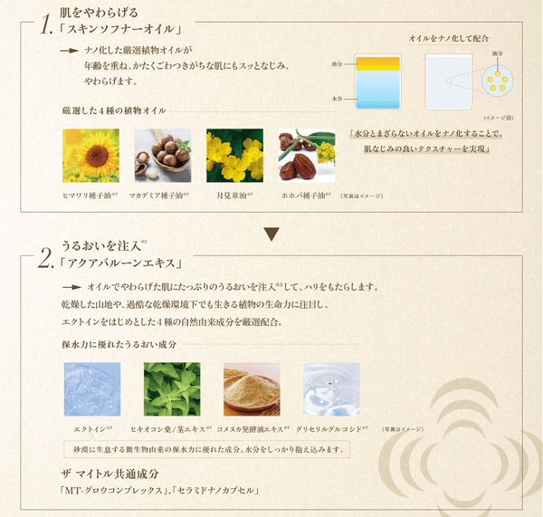 今回発売する2製品は、「ザ マイトル エッセンス」をお使いいただきながら、さらにうるおいやハリのある肌を目指したい方々にお使いいただきたい製品です。どちらも、当社の先端皮膚科学研究から導き出されたブランド共通のコンセプト成分を内包した2種のナノカプセルを配合しています。
