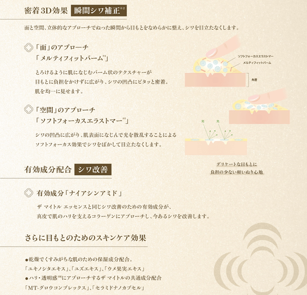 『ザ マイトル スムージングアイセラム』は、気になるシワを補正※2し、シワ改善に働きかける目もと用の薬用美容液です。シワの凹凸をなめらかに整える面のアプローチと、光を散乱させるソフトフォーカス効果の空間のアプローチでシワをぼかして目立たなくします。とろけるように肌になじむバーム状で、デリケートな目もとへの負担を軽減したこだわりのテクスチャーです。また、有効成分「ナイアシンアミド」配合で、使い続けることでシワを改善します。ラグジュアリー感あふれるフローラルの香りとなっています。