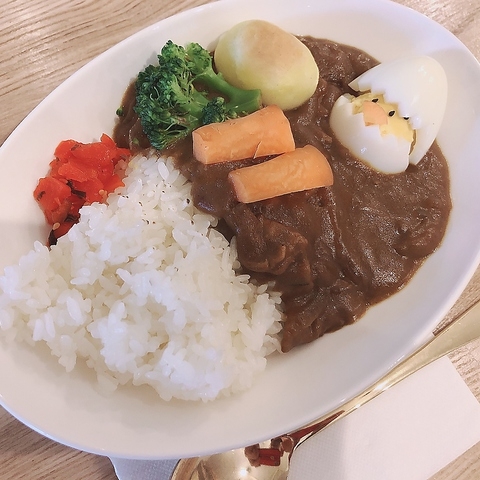 ホットサンドやカレー(甘口・辛口)、ナポリタンといった食事メニューも充実しており、カレーにはヒヨコをかたどった可愛らしいゆで卵がトッピングされています。