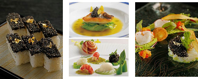 (左から)キャビアの押し寿司 / ムニュ・キャビア / 海星艶やかな見た目、上品な舌触りで世界中の美食家たちに愛され続けるキャビアを、各ジャンル趣向を凝らしてアレンジ。食材の魅力を知り尽くしたシェフが活躍する当ホテルの総力を結集した期間限定フェアです。