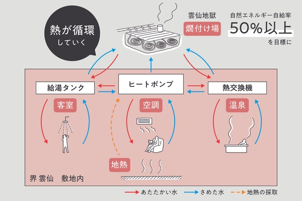 界 雲仙においても、給湯や温泉の加温、館内の空調に「燗付け」を活用します。また、界 雲仙独自の取り組みとして、雲仙地獄と地続きの立地を活かし、これまで使い切れていなかった建物直下の地熱を有効活用します。発生した熱を空調や給湯として使い、その後、冷めた熱を、ヒートポンプに投入することで、新たな熱が生まれる仕組みも取り入れました。この取り組みを行うことで、化石燃料を全く使うことなくエネルギーを賄うことができ、二酸化炭素の排出量もゼロとなります。そして、この取り組みにより、界 雲仙では、自然エネルギー自給率を50%以上にすることを目標にしています。