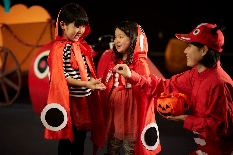 赤べこハロウィン期間中、館内に、赤べこの仮装をしたスタッフが現れます。スタッフは、いつ、どこに出没するかはわかりません。探して「トリックアトリート」と掛け声をかけてくれた小学生以下のお子様には、赤べこのお菓子をプレゼントします。