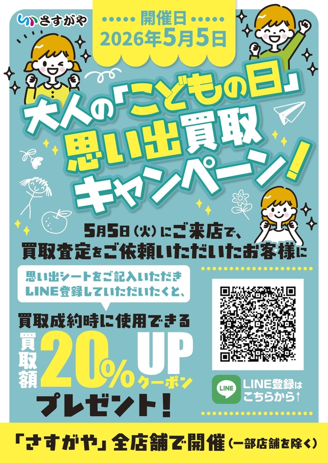 全国に100店舗以上の買取専門店を展開する株式会社さすがや(本社:東京都台東区、代表取締役:中崎杏美)は、ゴールデンウィーク期間中の2026年5月5日(こどもの日)に全国のさすがや直営店舗にて『大人の「こどもの日」思い出買取キャンペーン』を実施いたします。