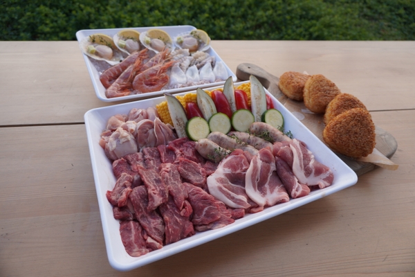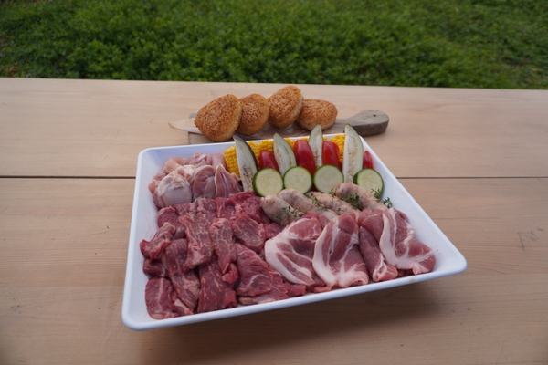 《内容》牛ロース、豚肩ロース、鶏もも肉、サルシッチャ、焼き野菜(パプリカ.ズッキーニ.茄子)、カットコーン、焼きおにぎり
