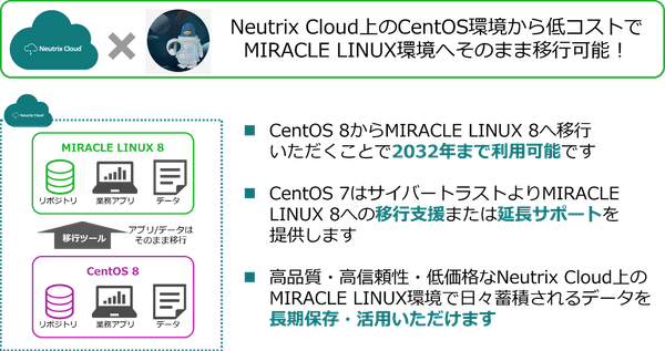 Neutrix Cloud Japan株式会社(本社:東京都千代田区、代表取締役社長CEO:田口 勉 以下、「NCJ」)と、サイバートラスト株式会社(本社:東京都港区、代表取締役社長:眞柄 泰利 以下、「サイバートラスト」)は、サイバートラストがライセンス費用無償で提供するRed Hat Enterprise Linux(RHEL)クローンの国産 Linux OS「MIRACLE LINUX 8.4」の提供におけるパートナーシップで合意しました。NCJは、自社のクラウドサービスである「ニュートリックスクラウド」において、「MIRACLE LINUX 8.4」を2022年8月3日より提供します。これにより、ニュートリックスクラウドのユーザーは「コンピュート」のシステムテンプレートとして「MIRACLE LINUX 8.4」を選択することで安定したLinux環境を最長12年の長期間利用することができます。