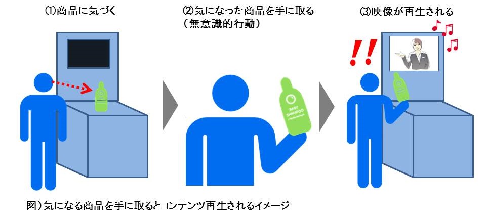 そこで今回impactTVでは「気になった商品を手に取る」という、消費者がこれまで自然に行っていた「無意識的行動」をトリガーにコンテンツが再生される、新たな店頭コミュニケーションツールを開発致しました。これにより「意識的行動」を起こさない消費者に対しても、商品購買検討段階における無意識的行動(気になった商品を手に取る)を起こした時点で映像と音を使ってメッセージを送り、自然なインタラクティブコミュニケーションを生み出すことが可能になり、消費者の購買意思決定の後押しを実現致します。