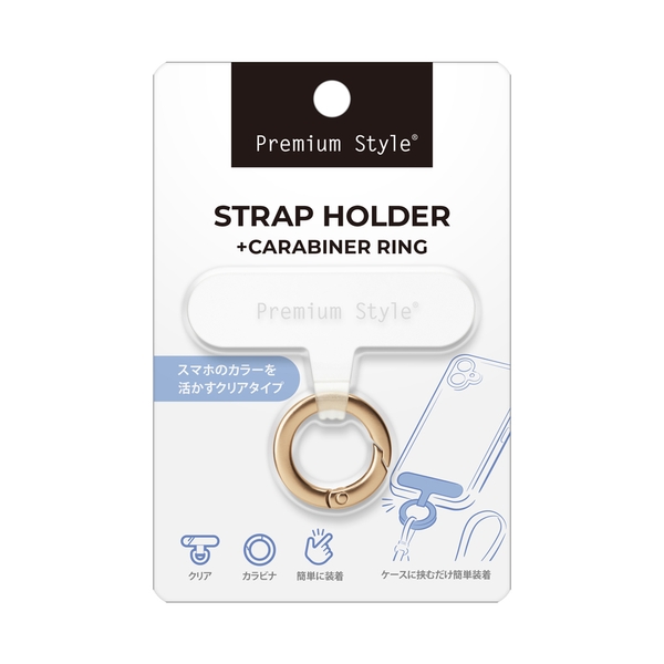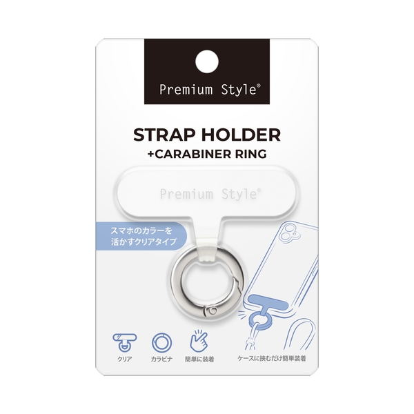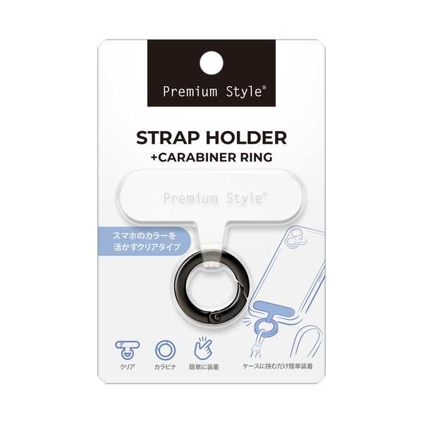 ストラップホールのないケースに挟むだけでストラップが付けられるカラビナリング付きストラップホルダーです。