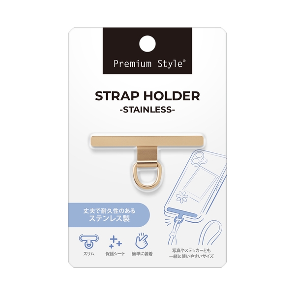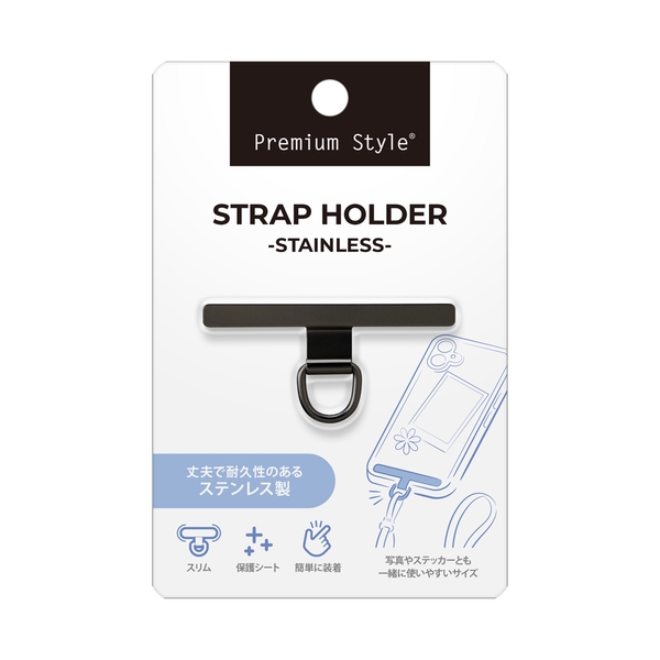 ストラップホールのないケースに挟むだけでストラップが付けられるストラップホルダー ステンレスタイプです。