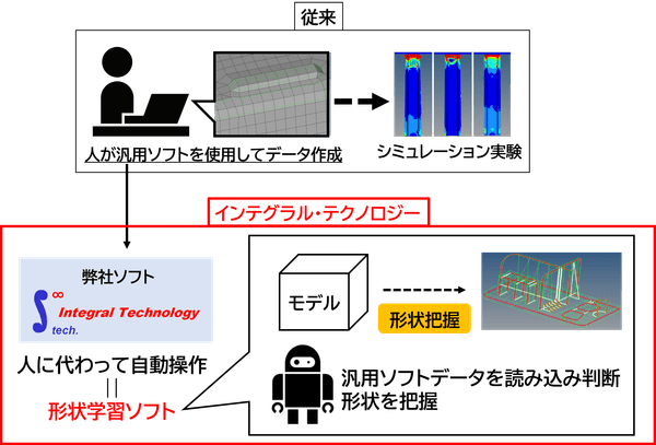 弊社ソフトは、シミュレーション実験⽤データ作成ソフトを⼈に代わって⾃動運転致します。PC 画⾯の形状を⾃動で認識し、形状にあった操作を⾏います。操作結果の判定も⾃動で行い、問題があれば修正致します。人の工数を多く必要とせず、シミュレーション作業の90%以上の⼯数割合となるモデリングを 80〜 95%短縮致します。近年では、AI技術を用いたメッシュ生成の開発に取り組んでおり、更なる形状認識・メッシュ生成の高速化に勤しんでいます。