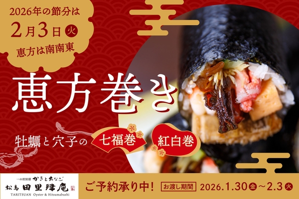 日本三景・松島湾を望む「かきとあなご 松島 田里津庵(たりつあん)」は、2026年1月30日(金)~2月3日(火)の恵方巻のご予約を受付中です。早期ご予約特典として、先着100本限定で特別価格でお買い求めいただけます。
