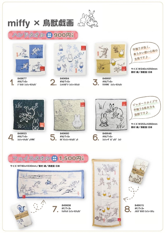 「誕生65周年記念 ミッフィー展」 にて登場した、miffyと平安時代から鎌倉時代前期にかけて描かれた鳥獣戯画のオリジナルグッズ。発売開始よりツイッターなども大きな反響を呼びながら、展示会先行発売のために全国のミッフィファンから待ち望まれているシリーズです。2020年9月12日に一般発売が解禁されました。