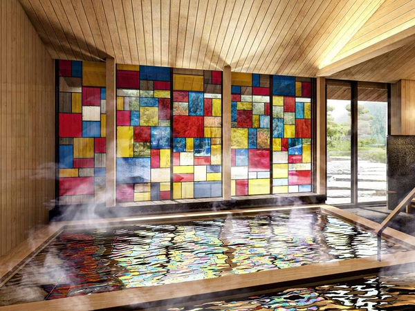 長崎県・雲仙温泉は、雲仙天草国立公園に位置し、立ち込める噴気や湯気、そして硫黄の香りが漂う温泉地です。雲仙温泉は、日本が鎖国していた時代に、出島を通じ、オランダ商館医のケンベルやシーボルトが訪れたとされ、海外諸国と歴史的な繋がりがある場所です。その歴史にちなみ、館内の設えには、様々な人や文化が行き交う中で発展してきた、和(日本)、華(中国)、蘭(オランダ)の要素が混ざり合った長崎文化を至るところに取り入れます。例えば、大浴場には、オランダから伝わった硝子工芸品であるステンドグラスを施しました。外光が差し込む時間帯には、色とりどりの鮮やかな光が湯面に映り込み、美しく輝きます。異国情緒あふれた華やかな長崎文化に触れることができる温泉宿です。