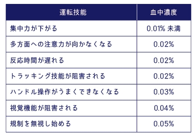 アルコールは運転に必要な技術や行動に対して極めて低い血中濃度から影響を与え、血中濃度が高くなればその分影響も強くなることが知られています。