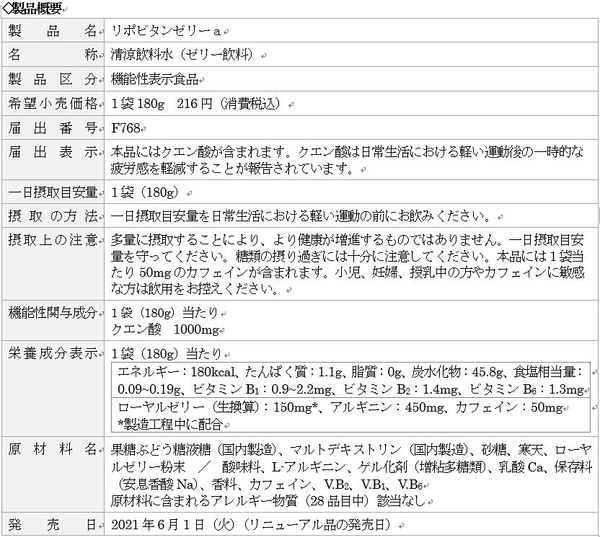 機能性表示食品となった「リポビタンゼリー」は、日常生活における軽い運動後の一時的な疲労感を軽減するクエン酸を1000mg配合したほか、ビタミンB1、B2、B6も配合した、手軽に摂取できるパウチタイプのゼリー飲料です。