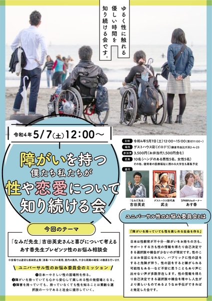 たとえ障害や病気、ハンデがあっても、人生楽しく生きたい。生きていてよかった、生まれてよかった、女性としても男性としても幸せを感じてほしいと願う。心身や、恋愛、性の悩みについて、共感共有し、学び、語れる場。