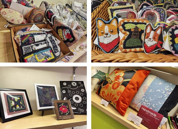 ショップでは、利用者さまが着物生地を丁寧にアップサイクルしたバッグ、ポーチ、傘や刺繍を施したブローチ、コラージュシートなど、オリジナリティあふれる一点ものを販売いたします。