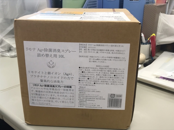 当社の検証結果3件においても高い消臭効果が確認され、販売元での検証結果でも同様でしたので、販売元が「リモナAg+」除菌消臭スプレーは業務用10リットルとして商品化され、当社は総販売店となりました。