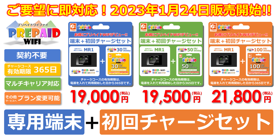 1月20日より販売を開始した、契約不要のチャージ式データ通信サービス『プリペイドWiFi』ですが、発売初日より「初回チャージ分」と「専用端末」の「お得なセットプランがほしい!」と、非常に多くのお客様よりご要望を頂戴しました。貴重なご意見を真摯に受け止め、この度、発売開始より4日で『赤字覚悟!』『業界最安値!』のセット商品の販売を開始致します。