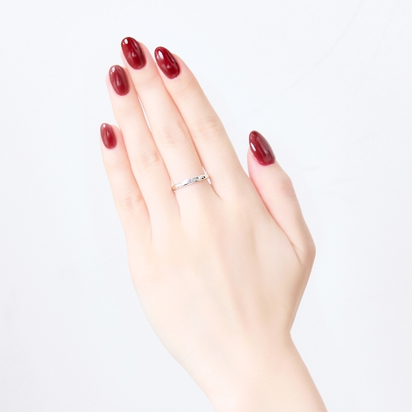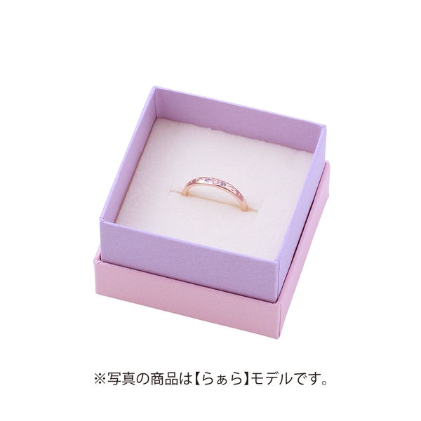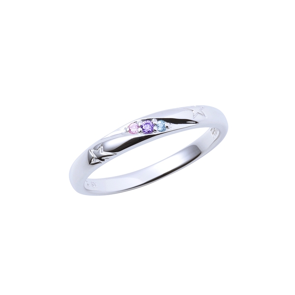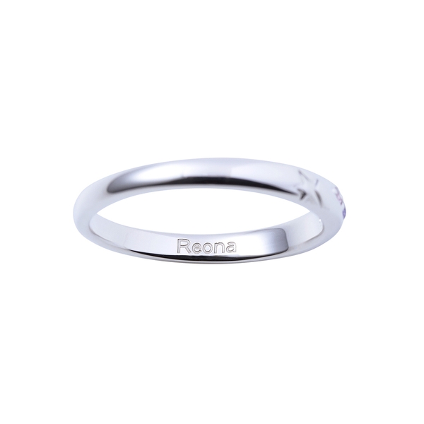 甲丸フォルムの表面には、ドレッシングパフェのチームロゴから模様を取り込み3石のカラーストーンをセット。内側には名前刻印を施しました。