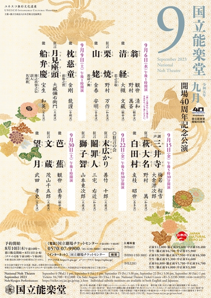 国立能楽堂(東京都渋谷区千駄ヶ谷4-18-1)の9月主催公演が下記の通り上演されます。昭和58年に開場した国立能楽堂が、9月に40周年を迎えることを記念した公演です。現代能楽界を代表する演者による能と狂言の名作の数々をご覧いただきます。