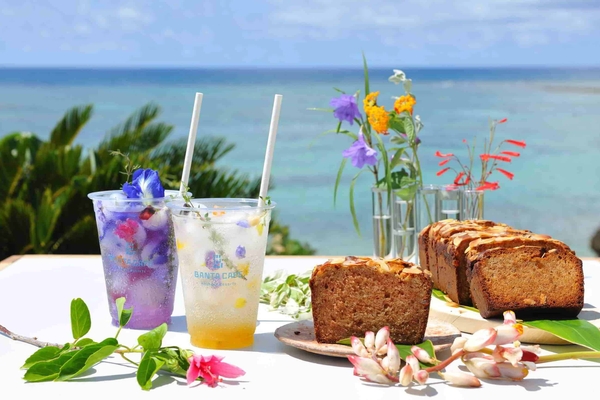 カフェでは色とりどりの華やかなアートにちなんで、沖縄で愛される花を用いたメニューを期間限定で提供します。アートで彩られるようなカラフルなドリンクのアイスキューブには、エディブルフラワーを閉じ込めました。海を眺めながらゆっくり味わえば、カップの中に花が咲きます。その他にも、沖縄を代表する「月桃」の花や葉を生地に練り込んだ、「月桃のホワイトガトーショコラ」は、月桃のスパイシーで爽やかな甘みのある香りも一緒にしっとりと焼き上げました。沖縄で親しまれている花を美味しく堪能できるメニューです。