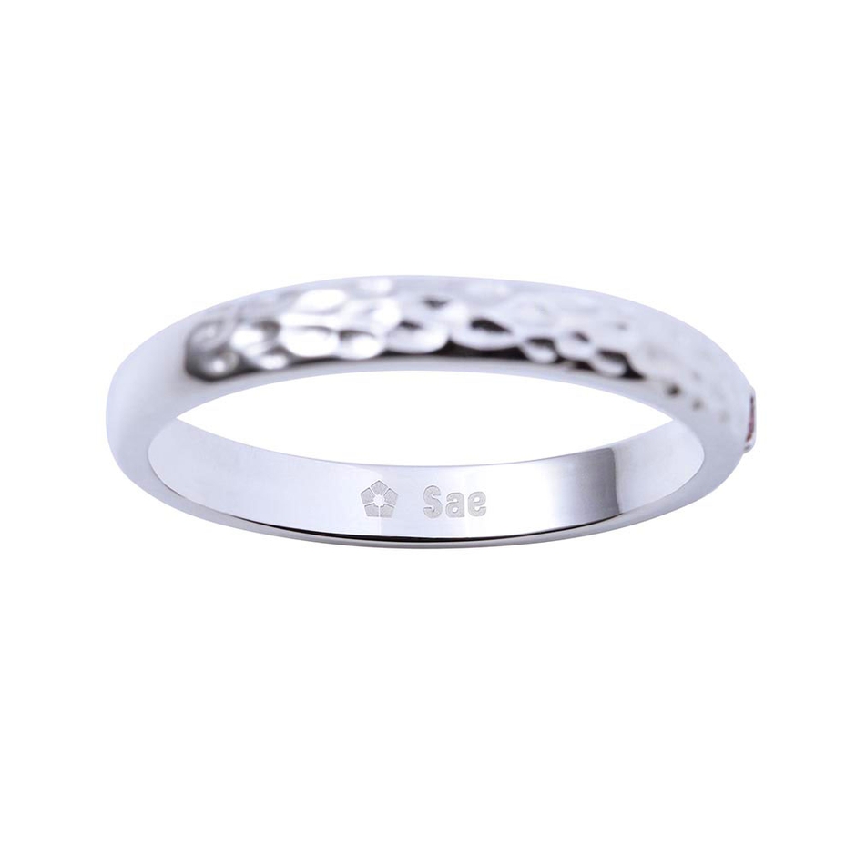 甲丸リングに槌目加工を施し、イメージカラーストーンをセット。作品の世界観をデザインに取り込みました。
