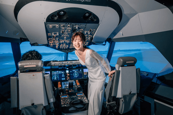 フライトシミュレーター:本物さながらの臨場感あふれるコックピットで叶える、特別な時間。精巧な操縦席で見つめ合う姿を写した一枚は、ドラマチックな仕上がりに。