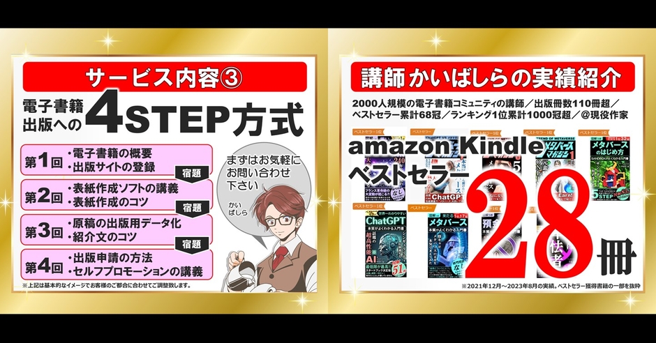 また、電子書籍を出版できても、売れないことには収入は入ってきません。そこで本講座では、ベストセラーも獲得s経験があり、2000名規模の電子書籍コミュニティの講師も務めている僕(甲斐柱)が「売れやすい本のノウハウ」を10大特典として伝授していきます! 確実な効果をお約束するものではありませんが、実績と経験からできる限りのアドバイスをさせて頂きます。