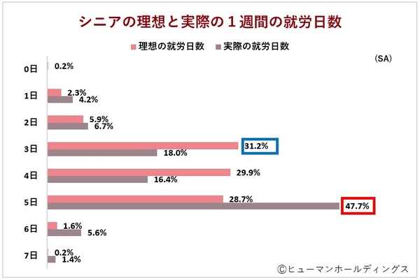 Q3.「理想的な1週間の就労日数」は「3日」が多数の一方、「実際の1週間の就労日数」は「5日」が47.7%