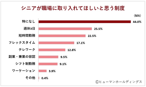 「職場に取り入れてほしい思う制度」(複数回答可)については「特になし(44.0%)」が最も多く、現状に対して不満はないように思われる一方で、「週休3日(25.5%)」「短時間勤務(22.5%)」と、休日や就労時間に対する総計は48%にのぼり、働く日数や時間を減らしたい意向も見受けられます。