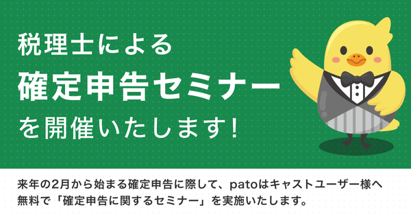 昨年に引き続き、patoではキャストユーザー様を対象とした無料の「確定申告に関するオンラインセミナー」を実施いたします。