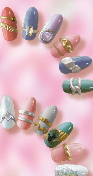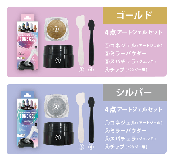 今回は、コネジェルとミラーパウダーをセットにして販売いたします。ゴールドとシルバーの2タイプをご用意いたしました。いつものジェルに1品買い足すだけで、いろいろな立体アートや人気の指輪ネイルなどができるようになるセットです。