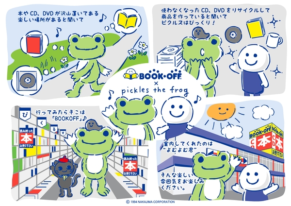 株式会社ナカジマコーポレーション(代表取締役:伊川慎一)のオリジナルキャラクター「かえるのピクルス」と、ブックオフコーポレーション株式会社(代表取締役社長:堀内康隆)のオリジナルキャラクター「よむよむ君」がコラボレーションし、お客様が手放したCD・DVDの再生プラ素材を生かしたサステナブルな雑貨アイテムを展開いたします。