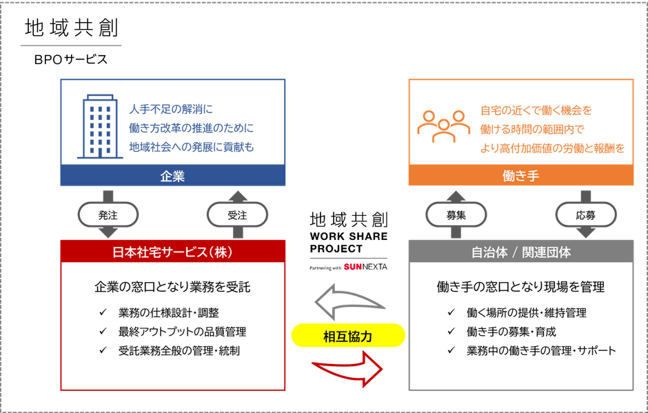 日本社宅サービスは「地域共創BPOサービス」を通して、企業が地域とともに手を取り合い、豊かに共存する新たな未来を目指します。
