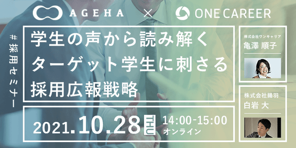 株式会社揚羽は2021年10月28日(木)に ワンキャリア様をゲストにお迎えし、 ”学生の声から読み解くターゲットに刺さる採用広報戦略” と題したセミナーを開催いたします。