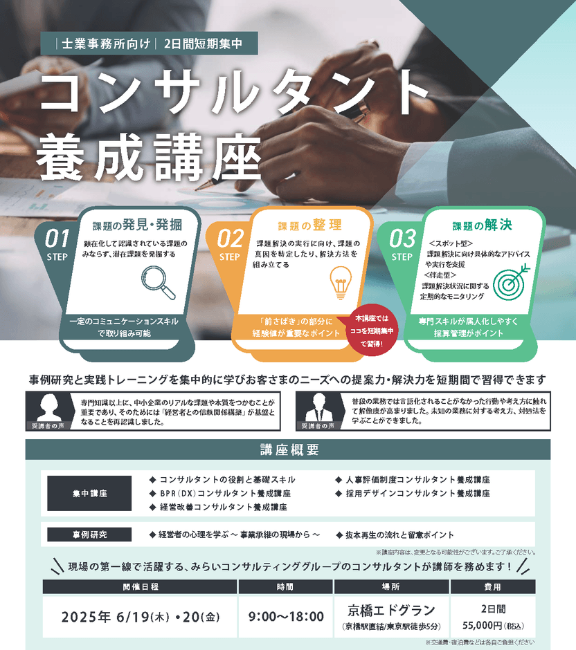 「士業事務所向けコンサルタント養成講座」は、みらいコンサルティンググループのパーパス、行動指針(MCWAY)、国内・海外のお客さま支援による地域貢献などの活動について、その共感・関心をいただいた士業事務所さまに参加いただき開催しています。みらいコンサルティングが培ってきたコンサルタントのあり方、コンサルティング手法[経営改善、事業承継、人事制度、採用デザイン、DXのコンサルティングの知識・事例研究・実践トレーニング]を、みらいコンサルティングのコンサルタントが講師として、座学とグループディスカッションにより集中的に学び、お客さまへの提案力・解決力を短期間(2日間)で習得いただくプログラムになります。