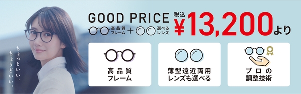 レンズ付 メガネ1組 税込¥13,200~、さらに見やすくなった遠近両用レンズをはじめ、パソコン・スマホなど比較的近くの距離が見やすい中近両用レンズ・近々両用レンズも追加料金なしで選べます。
