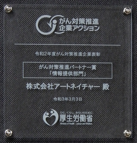 株式会社アートネイチャー(本社:東京都渋谷区 代表取締役会長兼社長 五十嵐祥剛)は、厚生労働省委託事業「がん対策推進企業アクション」の令和2年度がん対策推進企業表彰において、「がん対策推進パートナー賞」(情報提供部門)を受賞しました。