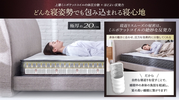 上層の超高密度ミニポケットコイルが点でフィットし、身体の動きに合わせて体圧を均等に分散。下層のオープンコイルは、連結構造により面で負荷を受け止め、しっかり支えます。2層コイル設計が理想的な寝姿勢へ導き、寝返りもスムーズで、一晩中快適な寝心地を実現。現在の寝具を硬く感じる場合や、横向き寝で圧迫感を覚える場合、適度な弾力に包まれる寝心地を求めるニーズに対応します。