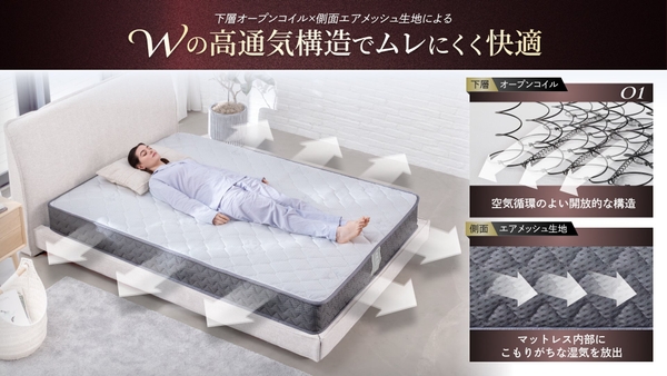 二重の通気構造により、睡眠中も快適な状態を維持。下層のオープンコイルは、空気の循環に優れた開放的な設計で、ムレや熱のこもりを防ぎます。さらに、側面のエアメッシュ生地がマットレス内部の湿気を効果的に放出。寝ている間も快適な温度と湿度を保ち、朝まで深い眠りをサポートします。