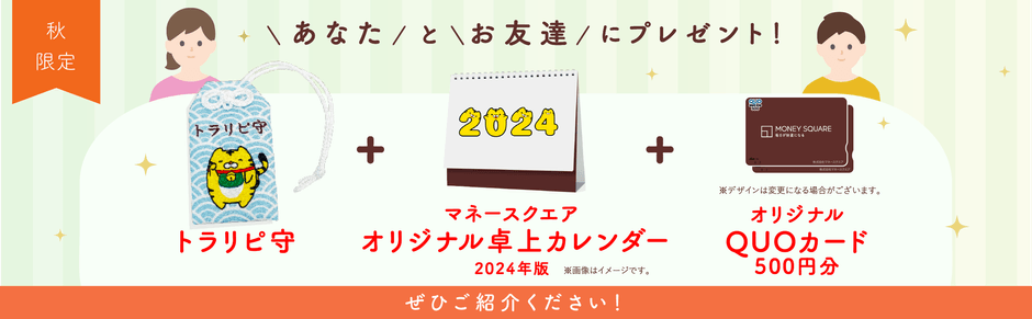 本キャンペーンページからエントリーされなかった場合、「トラリピ守」と「2024年版 マネースクエア オリジナル卓上カレンダー」プレゼントの対象となりません。