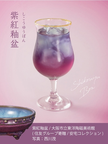 鈞窯(きんよう)特有の鮮やかな天青色釉と紫紅釉を、バタフライピーティーとレモンシロップ、パイナップル&ライチジュースで表現した、目にも鮮やかなオリジナルドリンクです。縁の金箔のアクセントが高貴さと非日常を演出します。