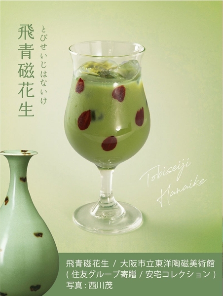 美術館を代表する国宝「飛青磁花生」をモチーフにしたオリジナルドリンクです。飛青磁は特に茶人の間で珍重されたという歴史にちなんで、抹茶ラテで青磁を表現しました。印象的な鉄斑は、チョコレートでグラスをデコレーションして表しています。