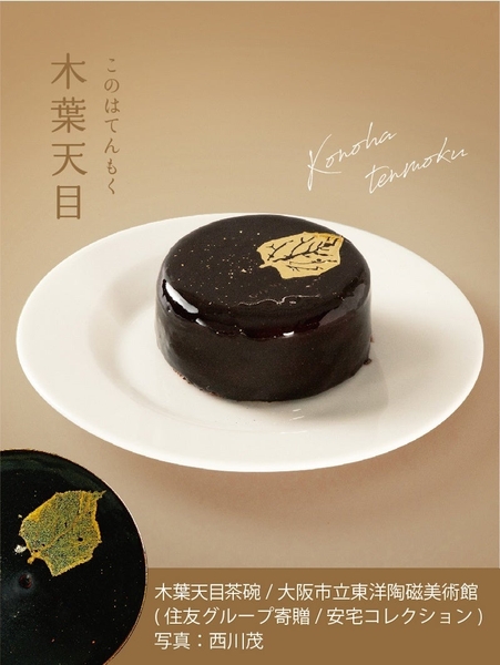 天目茶碗の艶やかさをイメージした濃厚なチョコレートムースに、桑の葉型の金箔を乗せ、金箔粉を散らしました。チョコレートムースは札幌の「Pâtisserie Jeunesse」若山氏特製のKITONARIオリジナルレシピで、札幌から直送して提供しています。